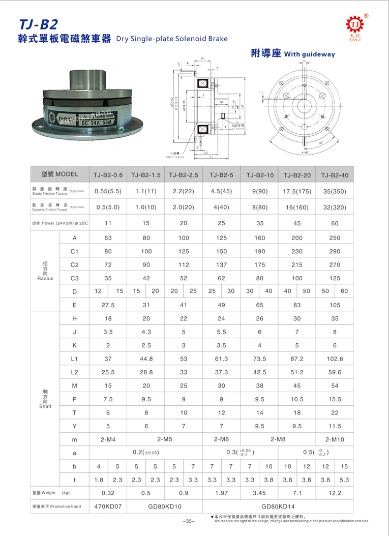 天機傳動單片式摩擦電磁制動器(剎車器)由銜鐵(電樞板)、定子、板型彈片、磁性線圈、來令片、鋁導座等元件構成,統一使用DC24V,標準規格0.6-40KG。