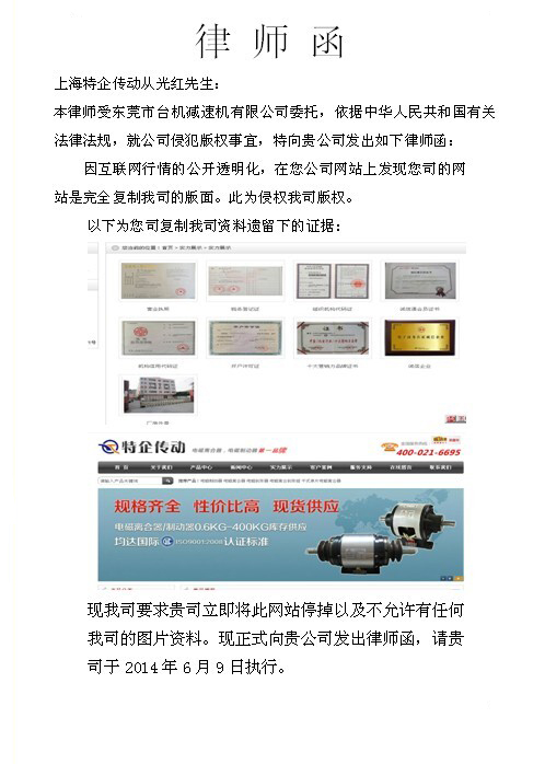上海特企傳動復制我司網站的版面,侵犯我司版權。依據中華人民共和國有關法律法規,2014年6月9號我司向上海特企傳動發出律師函,要求上海特企立即停止網站的運行以及去掉我司的圖片資料。